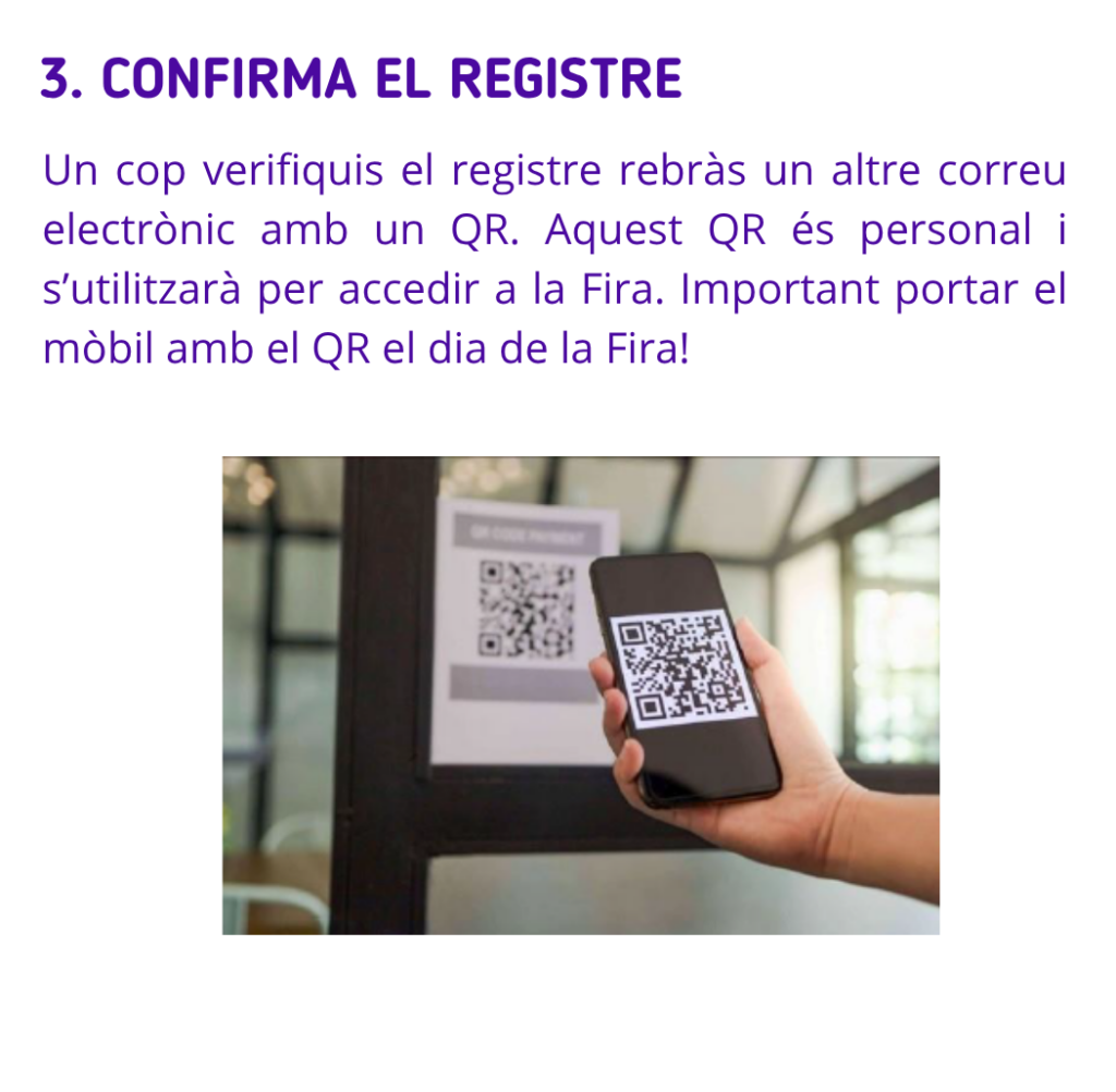 Un cop verifiquis el registre rebràs un altre correu electrònic amb un QR. Aquest QR és personal i s’utilitzarà per accedir a la Fira. Important portar el mòbil amb el QR el dia de la Fira!