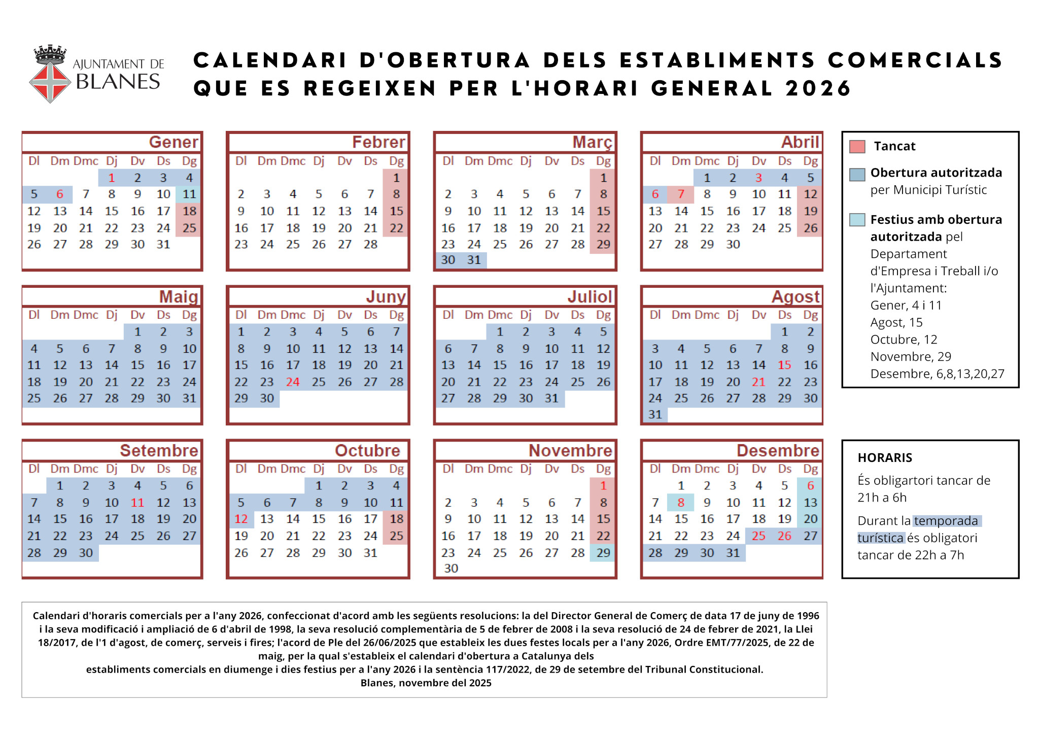 Calendari 2026 d’obertura d’establiments comercials que es regeixen per l’horari general.
